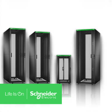 Rack com design econômico que integra perfeitamente acessórios de rack importantes, como Rack PDUs e gerenciadores de cabos.